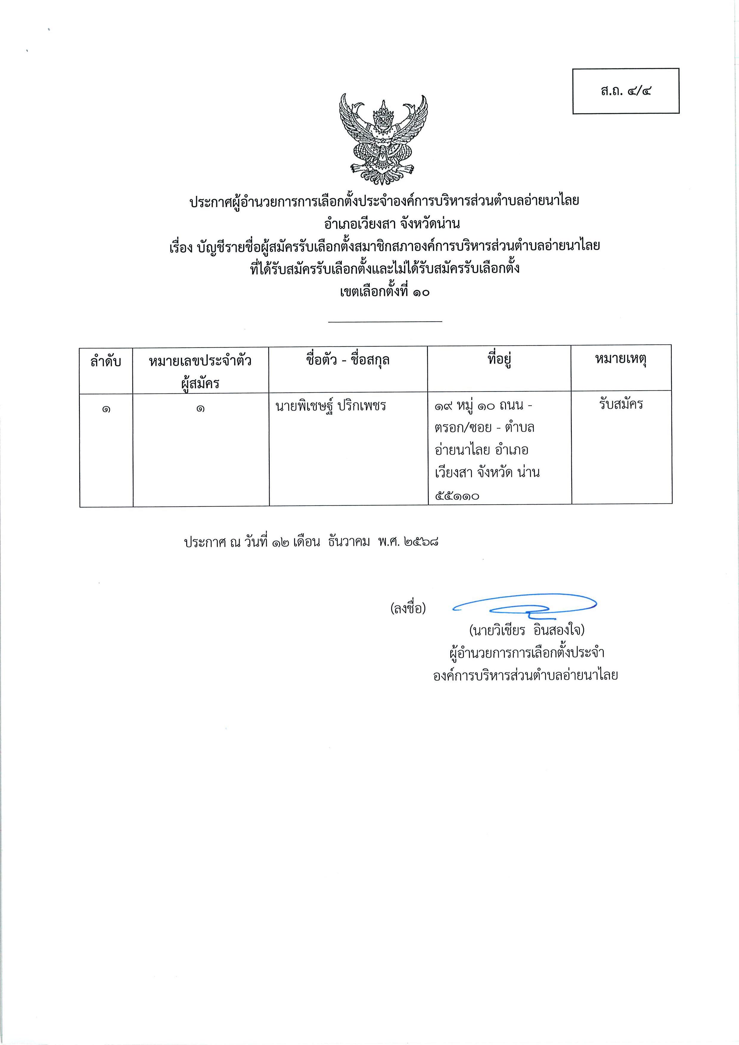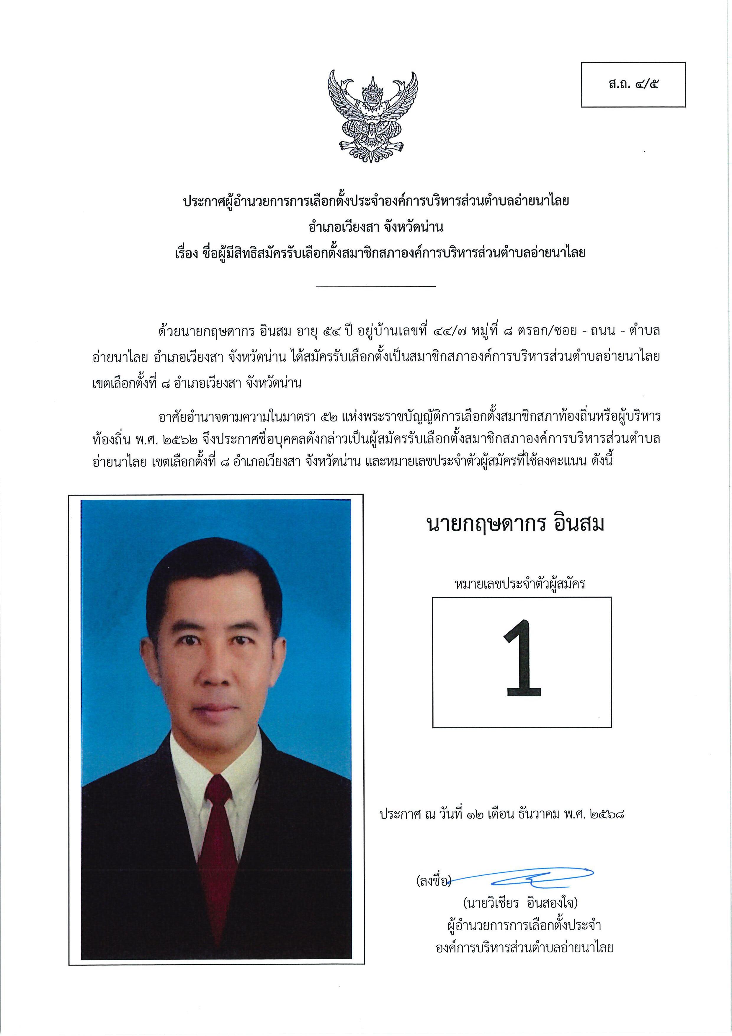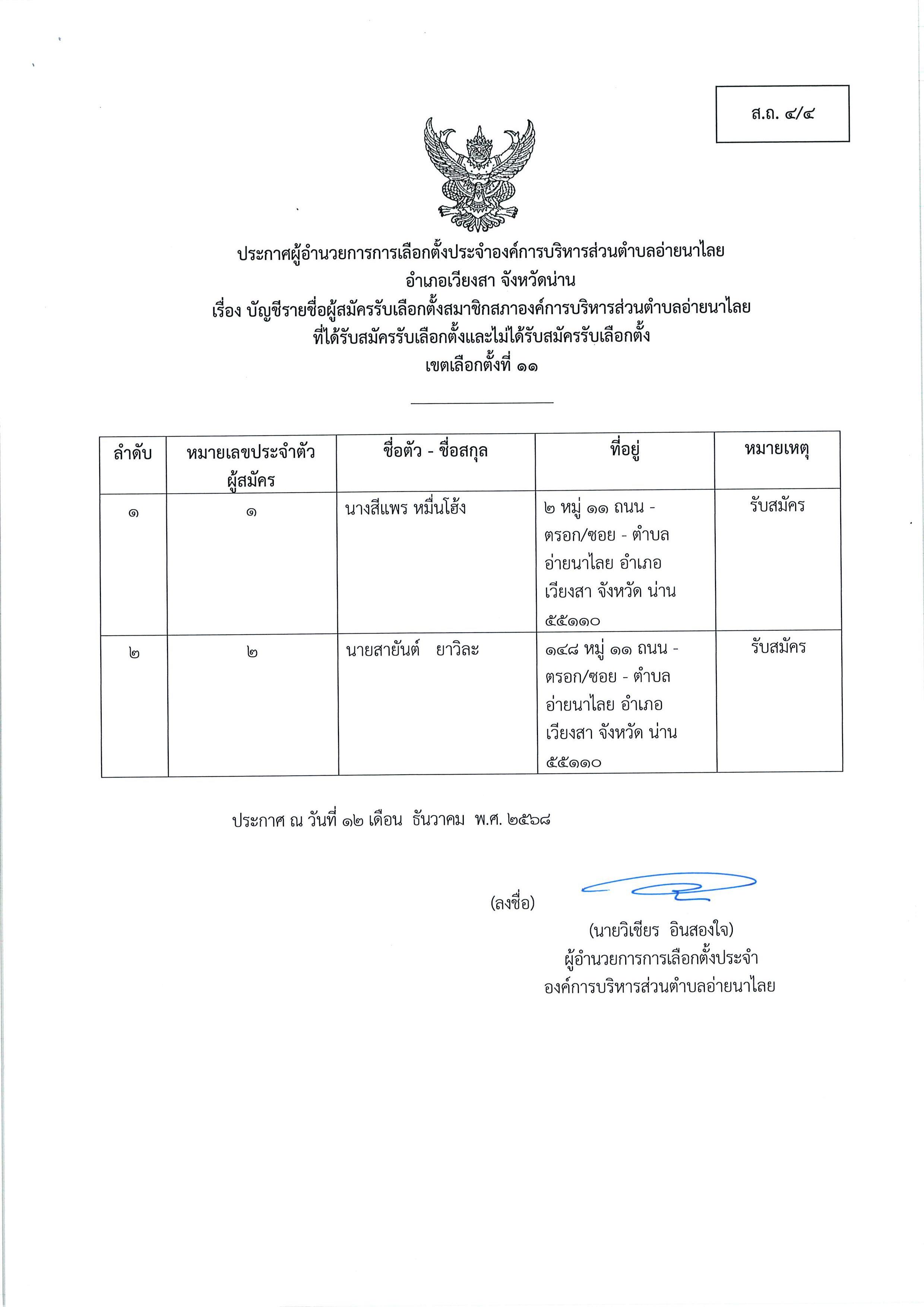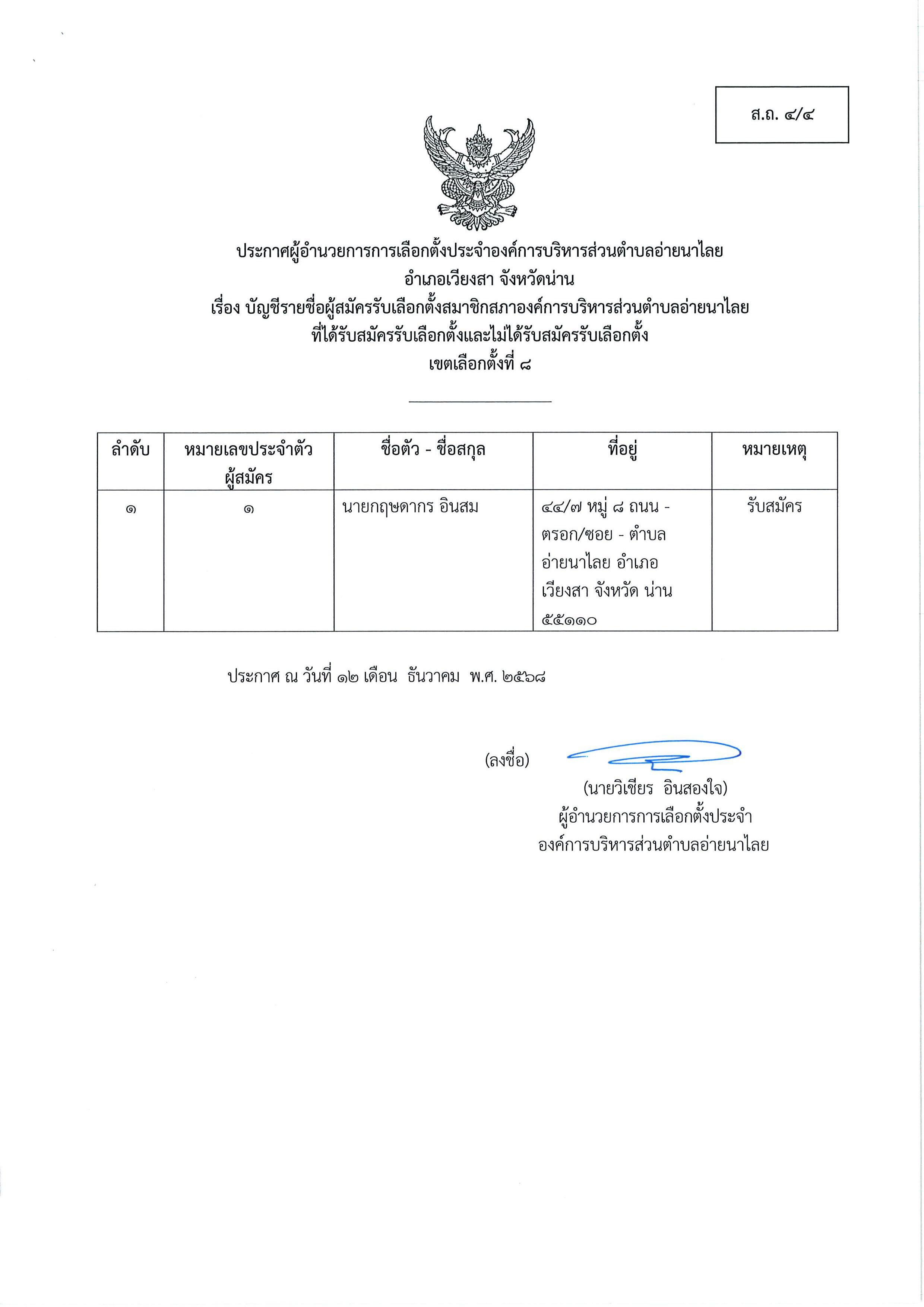 และนายกอบต.อ่ายนาไลย (ส.ถ./ผ.ถ.4/4) และ ประกาศชื่อผู้มีสิทธิสมัครรับเลือกตั้งฯ (ส.ถ./ผ.ถ.4/5)