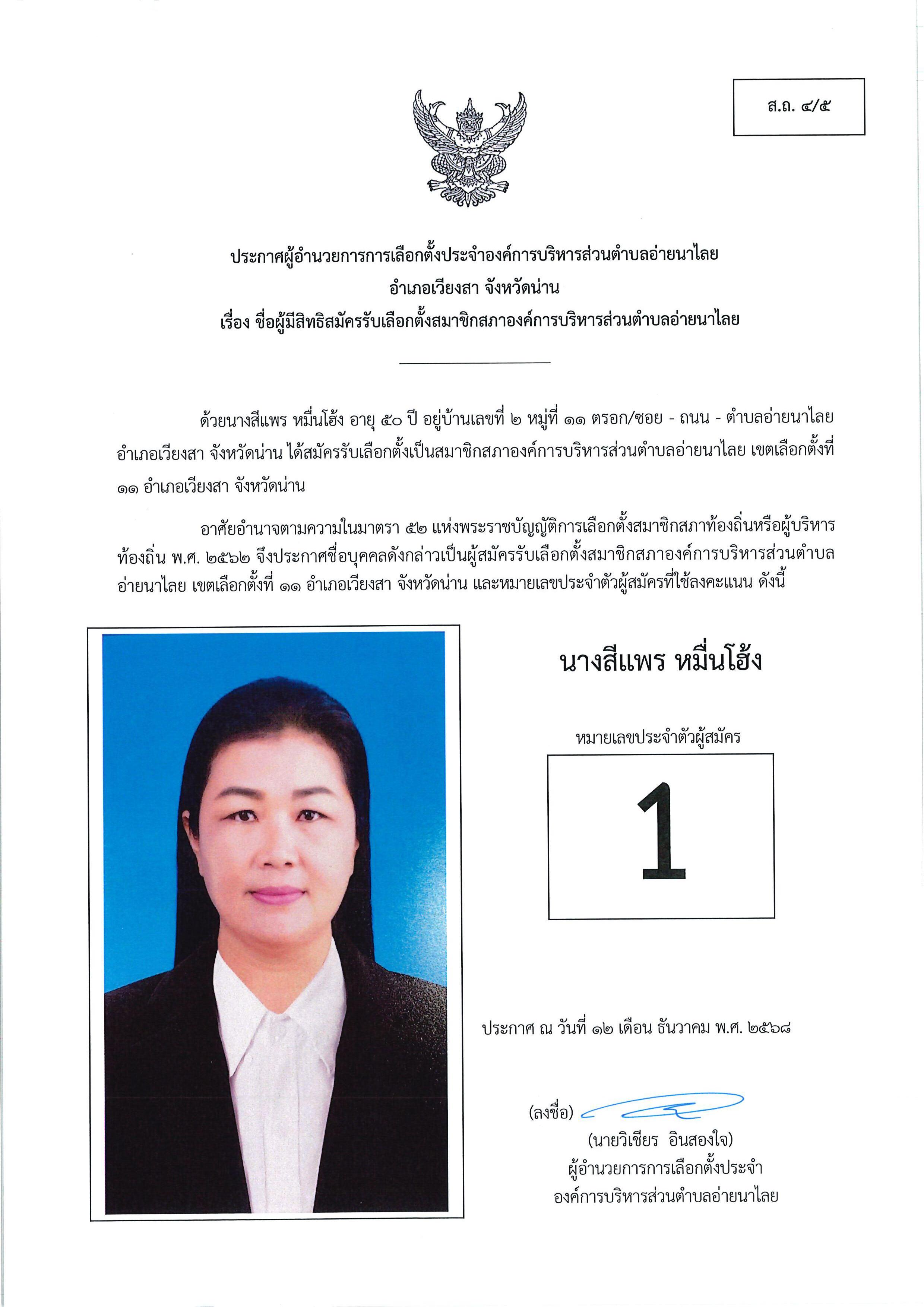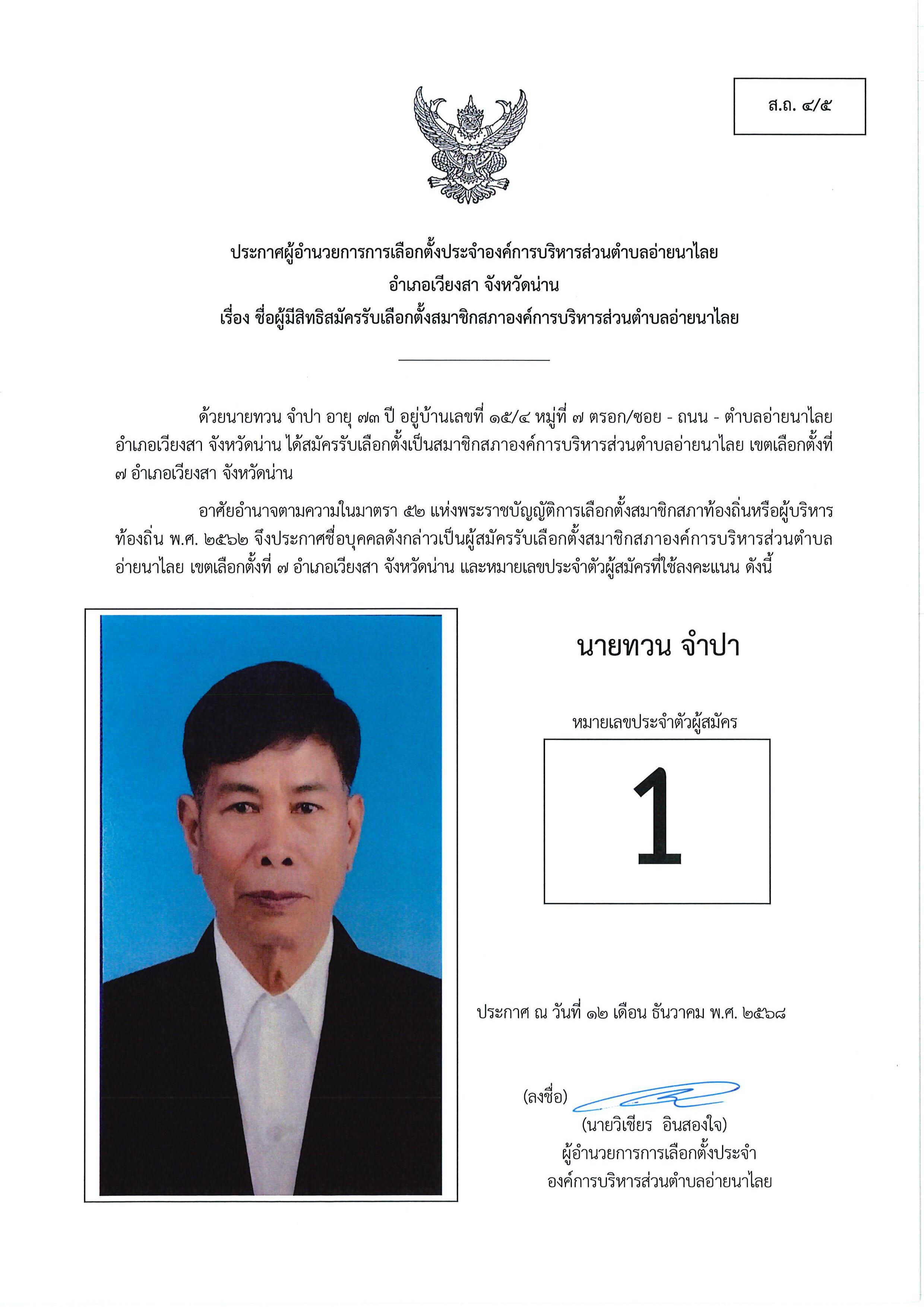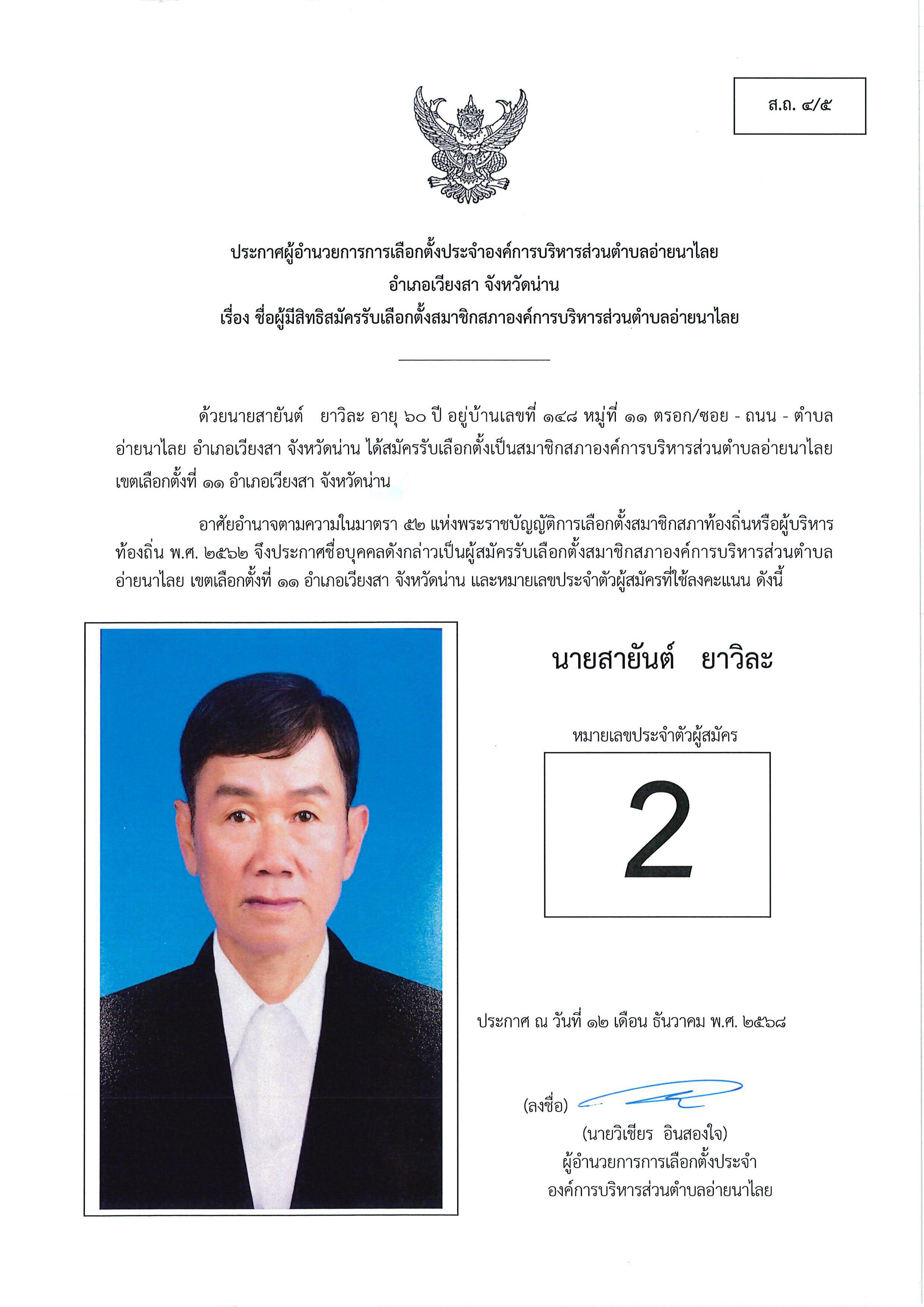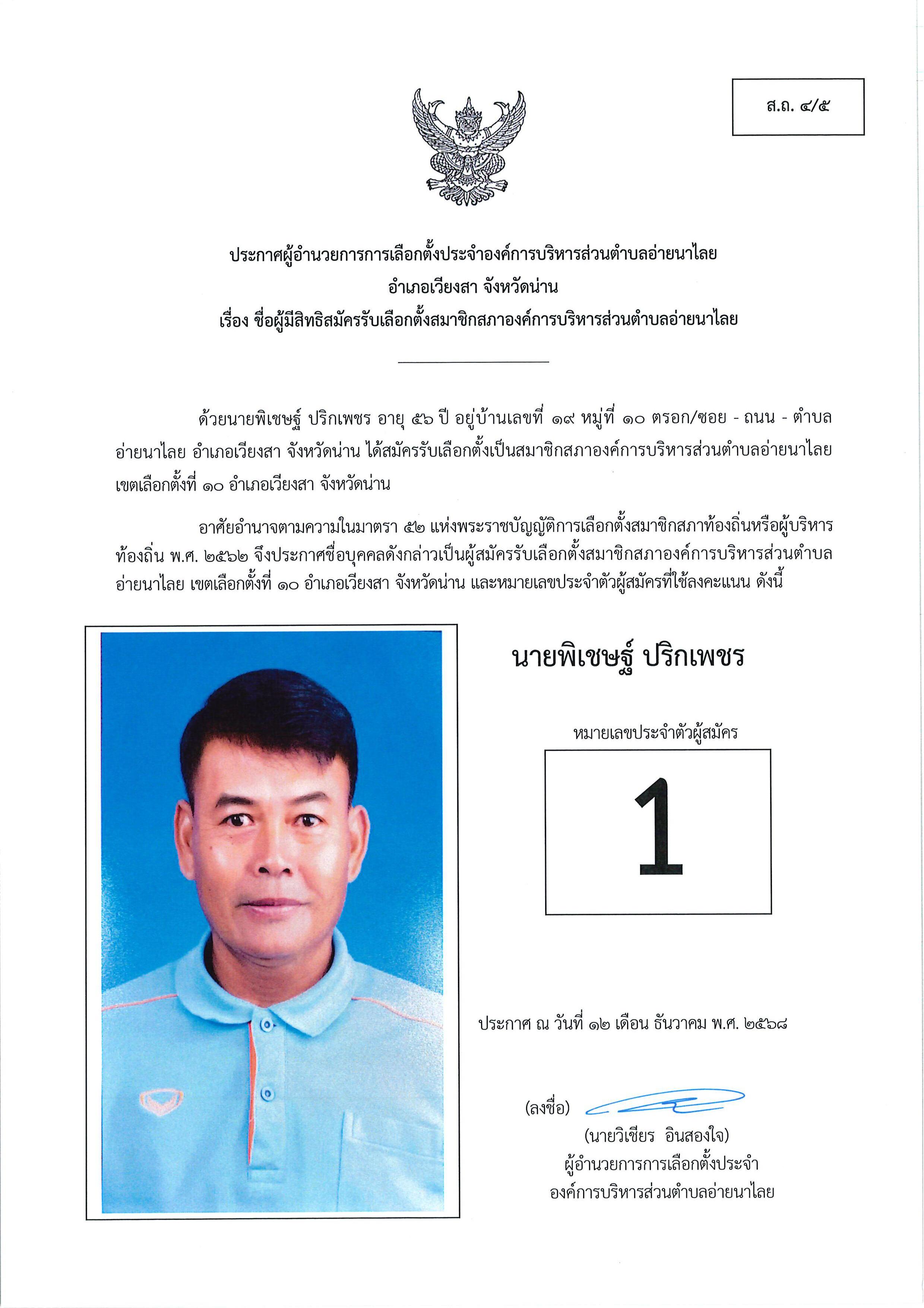 และนายกอบต.อ่ายนาไลย (ส.ถ./ผ.ถ.4/4) และ ประกาศชื่อผู้มีสิทธิสมัครรับเลือกตั้งฯ (ส.ถ./ผ.ถ.4/5)