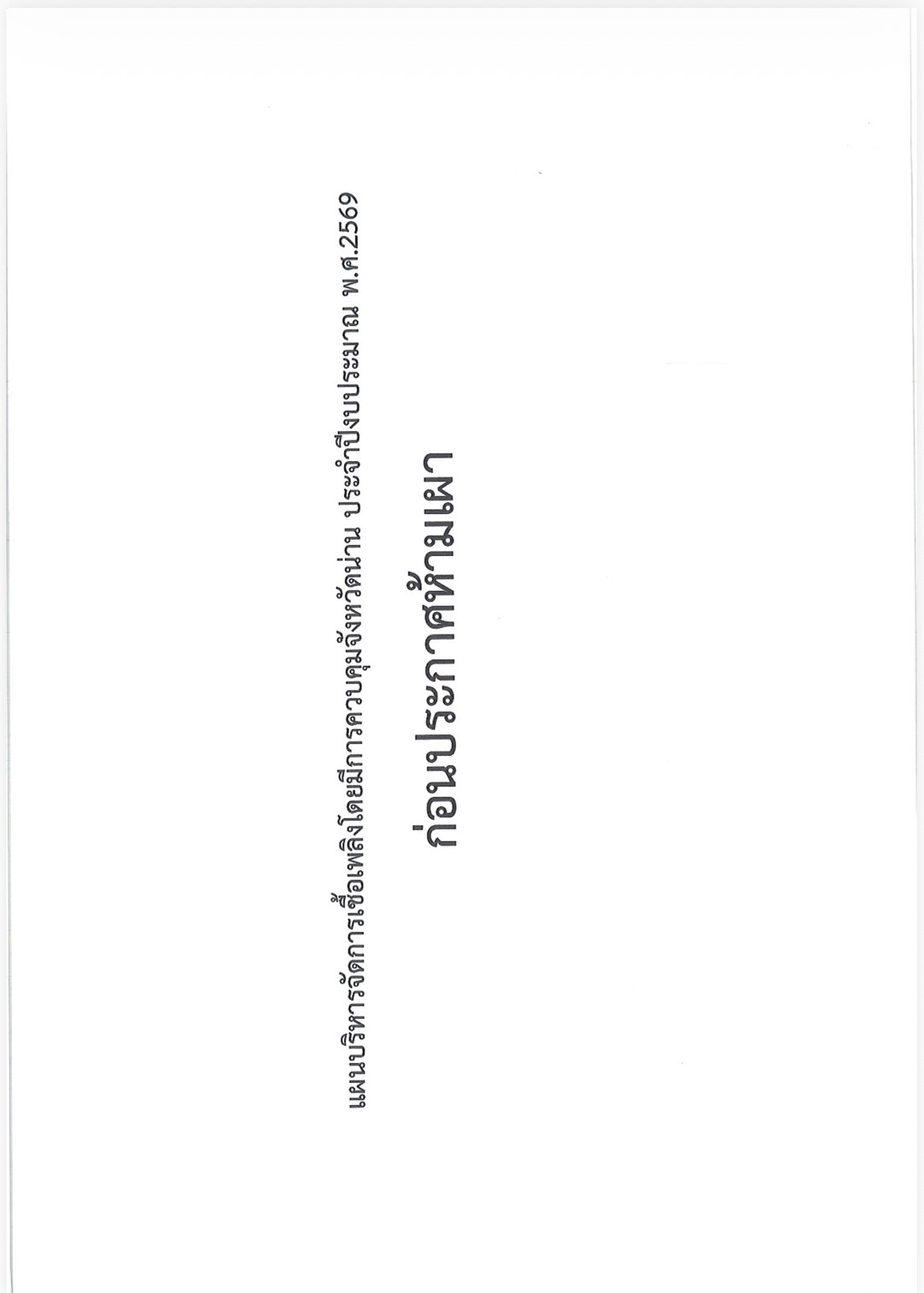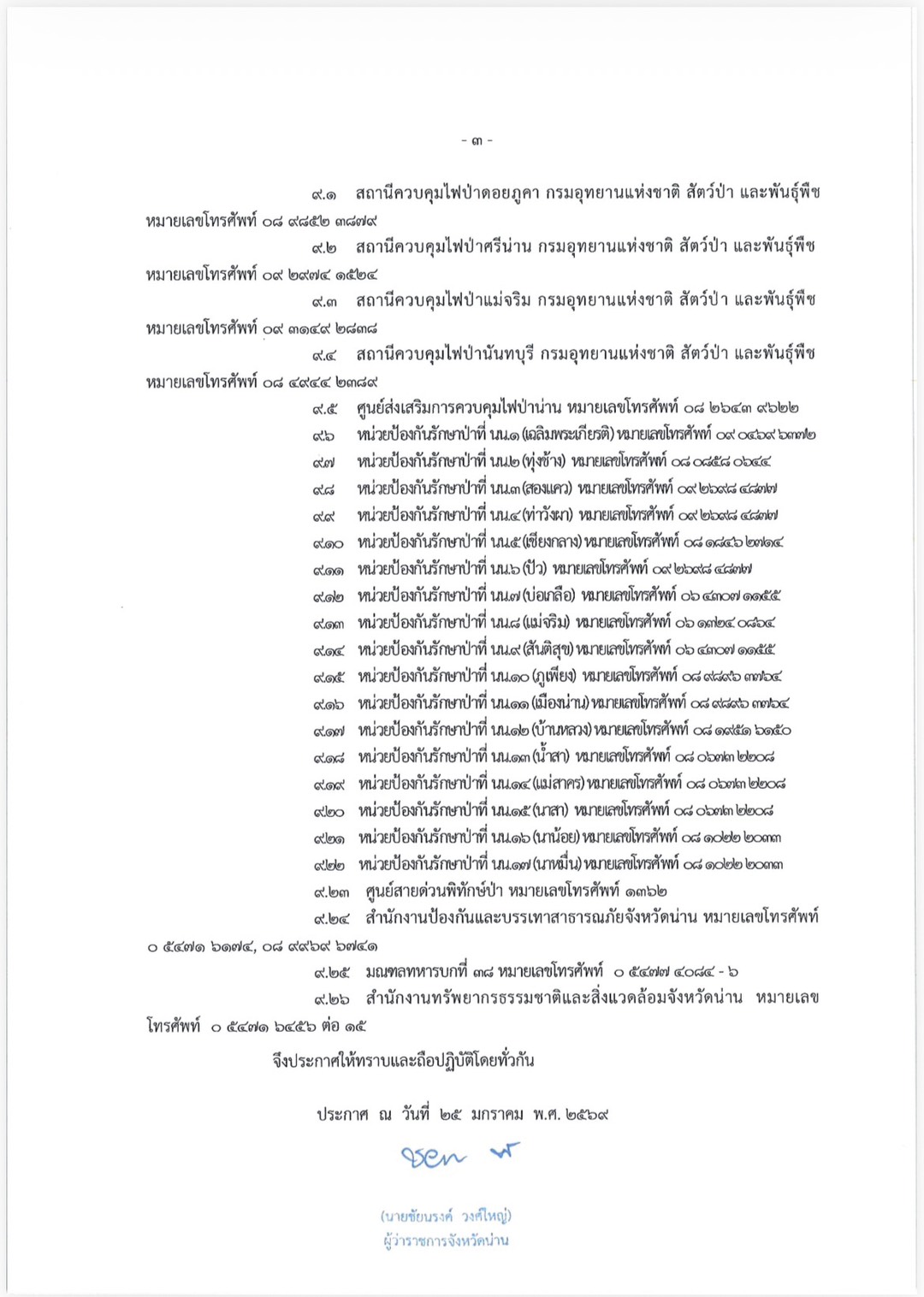 - ประกาศจังหวัดน่าน เรื่อง กำหนดพื้นที่ควบคุมการเผาในพื้นที่โล่งทุกชนิดและห้ามเผาโดยเด็ดขาดเพื่อแก้ไขปัญหาไฟป่า หมอกควันและฝุ่นละอองขนาดเล็ก (PM2.5) ในพื้นที่จังหวัดน่าน ประจำปี พ.ศ. 2569