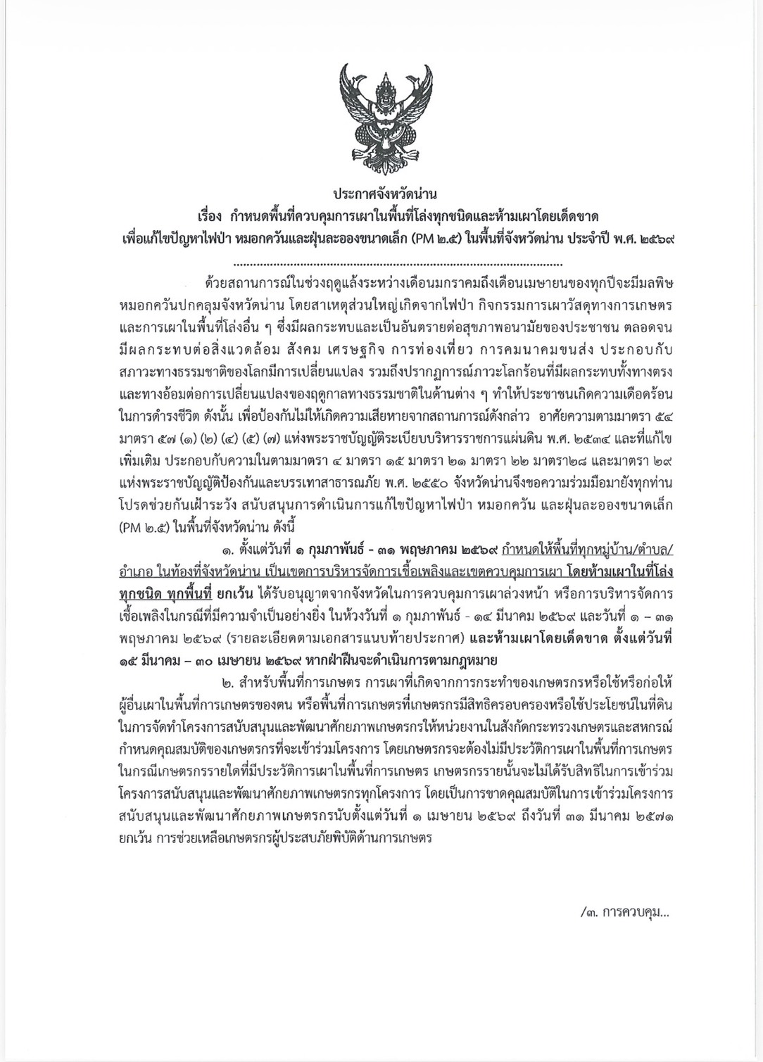 ประกาศจังหวัดน่าน เรื่อง กำหนดพื้นที่ควบคุมการเผาในพื้นที่โล่งทุกชนิดและห้ามเผาโดยเด็ดขาดเพื่อแก้ไขปัญหาไฟป่า หมอกควันและฝุ่นละอองขนาดเล็ก (PM2.5) ในพื้นที่จังหวัดน่าน ประจำปี พ.ศ. 2569