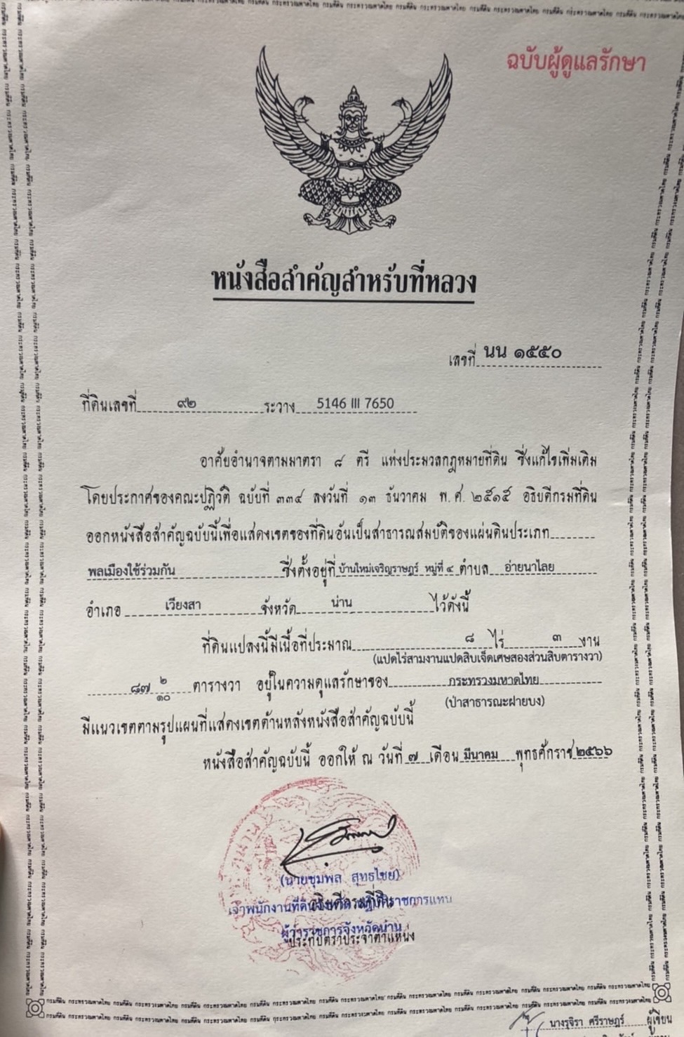 อ่ายนาไลย ได้ไปสำนักงานที่ดินจังหวัดน่าน สาขาเวียงสา เพื่อติดต่อขอรับหนังสือสำคัญสำหรับที่หลวง ประเภท พลเมืองใช้ร่วมกัน แปลง “ป่าสาธารณะฝายบง” โดยท่านผู้ว่าราชการจังหวัดน่านได้ลงนามเป็นที่เรียบร้อยแล้ว ซึ่งแปลงป่าสาธารณะฝายบง ตั้งอยู่บ้านใหม่เจริญราษฎร์ หมู่ 4 ตำบลอ่ายนาไลย อำเภอเวียงสา จังหวัดน่าน ซึ่งองค์การบริหารส่วนจังหวัดน่าน จะทำหนังสือติดต่อเข้ามาเพื่อขอเข้าใช้ต่อไป