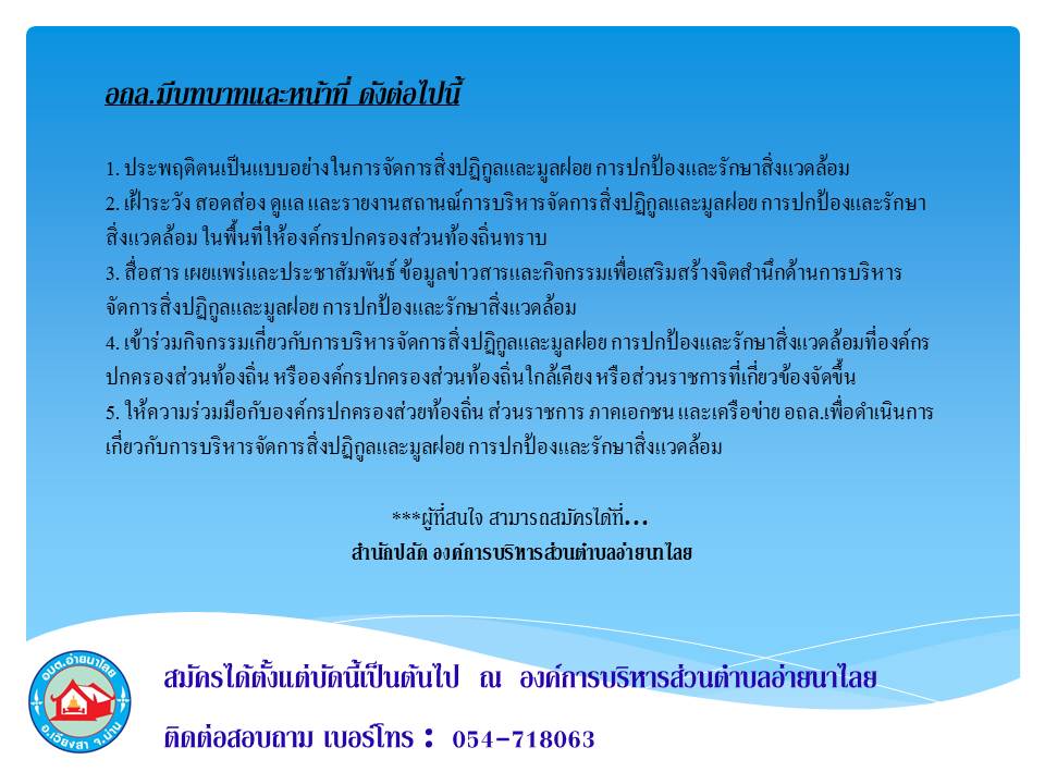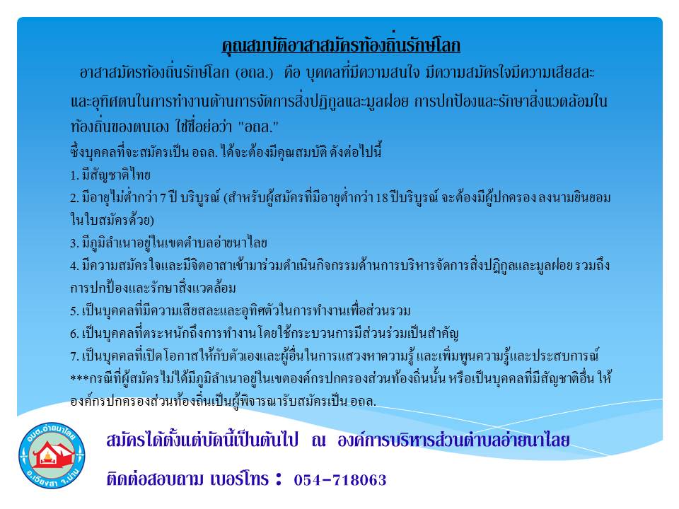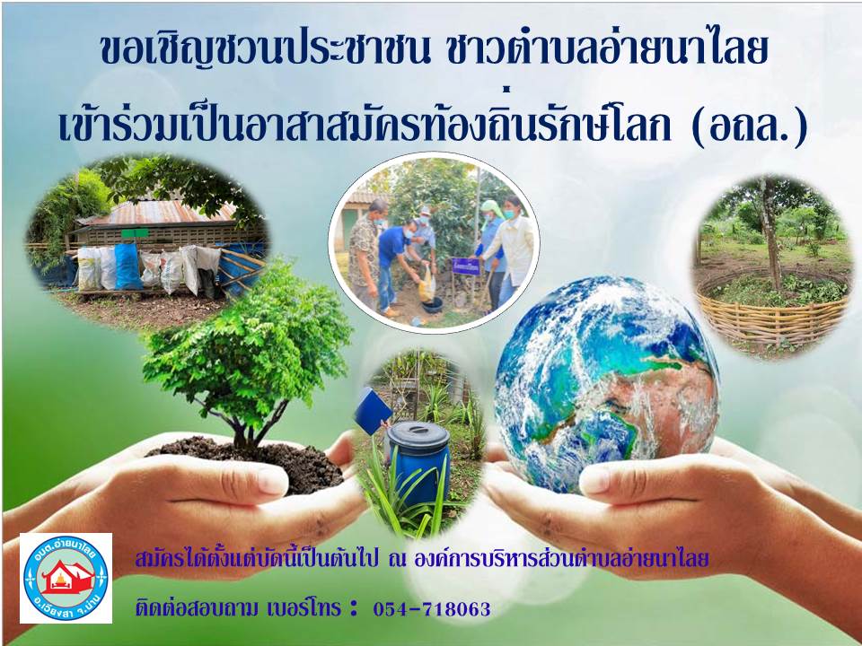 ขออนุญาตประชาสัมพันธ์ค่ะ องค์การบริหารส่วนตำบลอ่ายนาไลย ขอเชิญชวนพี่น้อง ชาวบ้านตำบลอ่ายนาไลย เข้าร่วมเป็นอาสาสมัครท้องถิ่นรักษ์โลก(อถล.)
