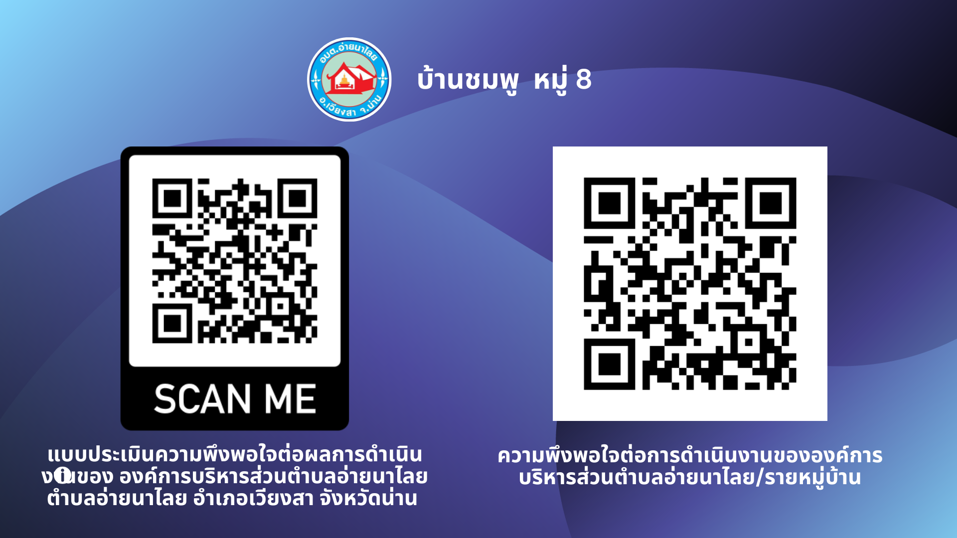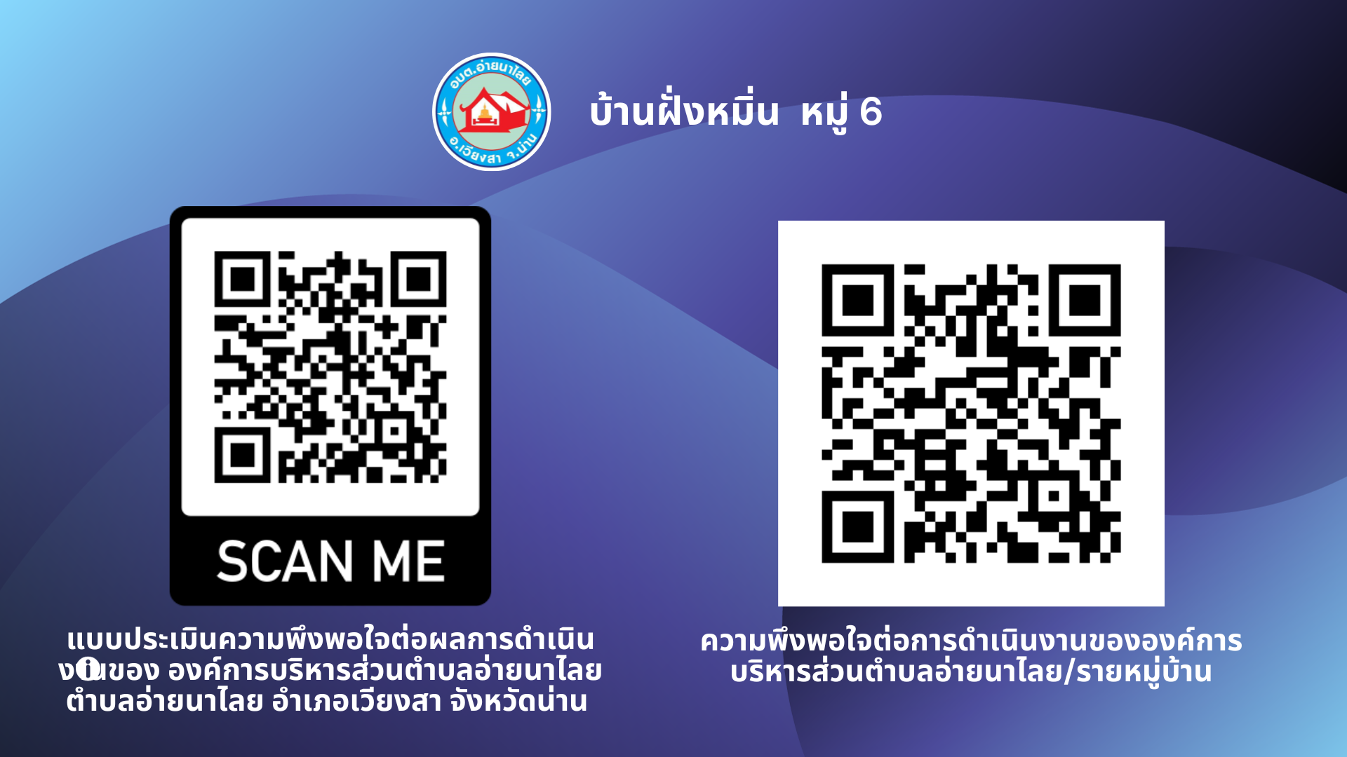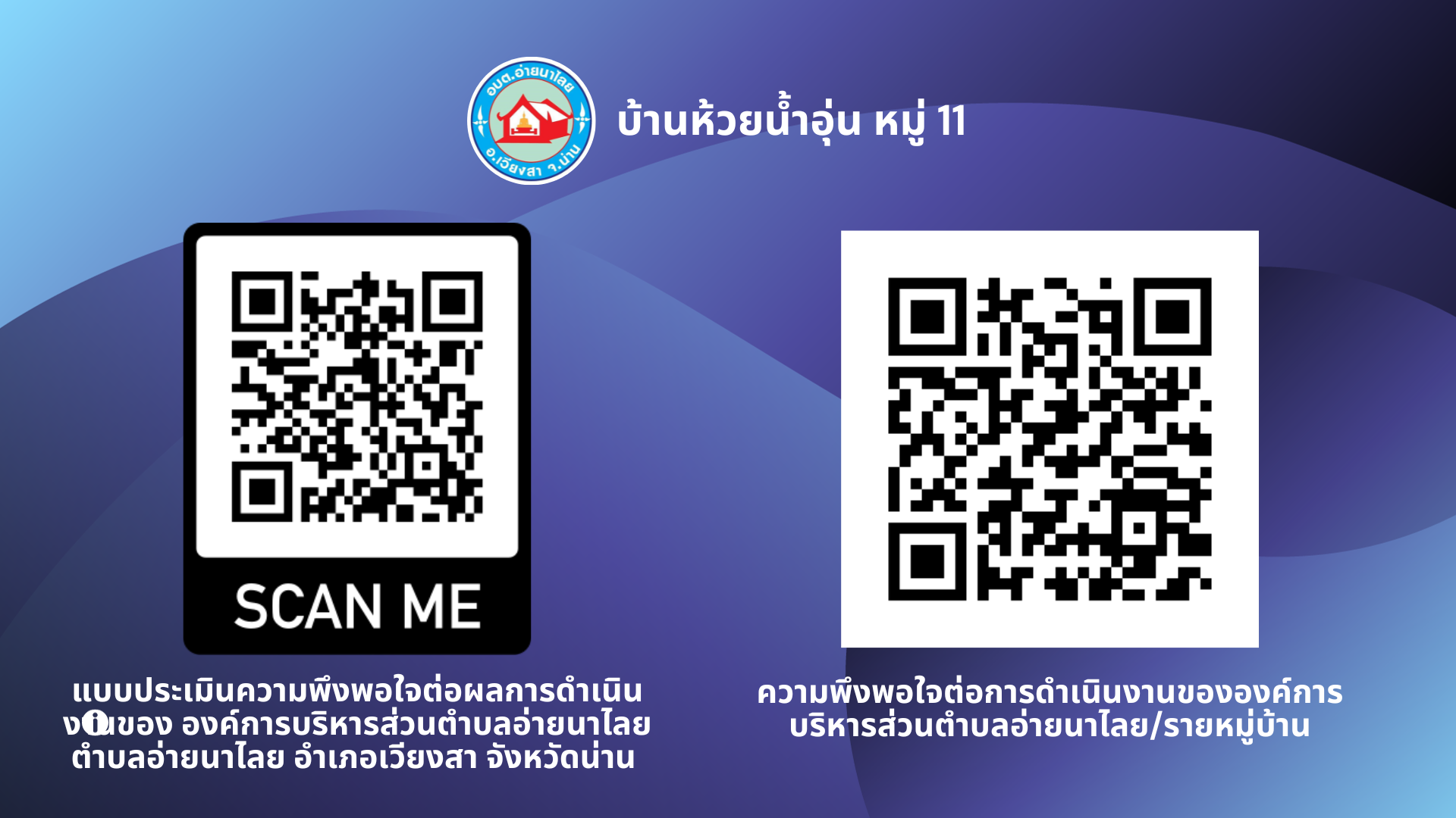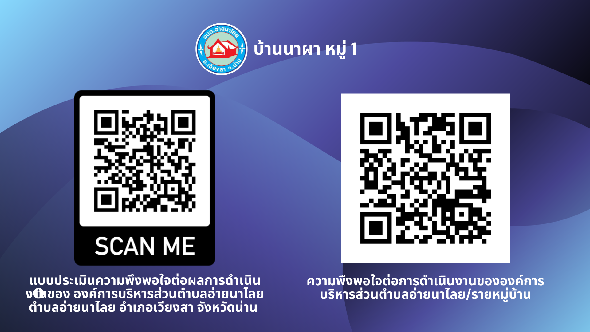 ประชาสัมพันธ์เชิญชวนทำแบบประเมินความพึงพอใจต่อผลการดำเนินงานของอบต.อ่ายนาไลย และ รายหมู่บ้าน ท่านสามารถสแกน QR Code ตามหมู่บ้านของท่านเพื่อทำการประเมินได้เลย ขอบคุณครับ/ค่ะ