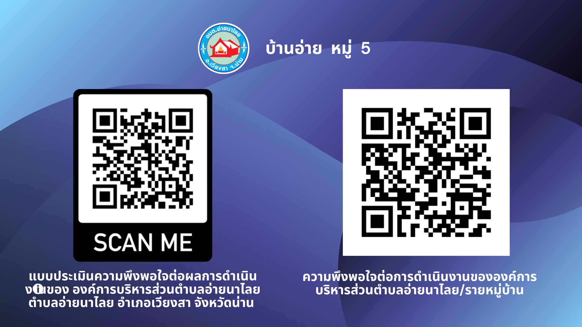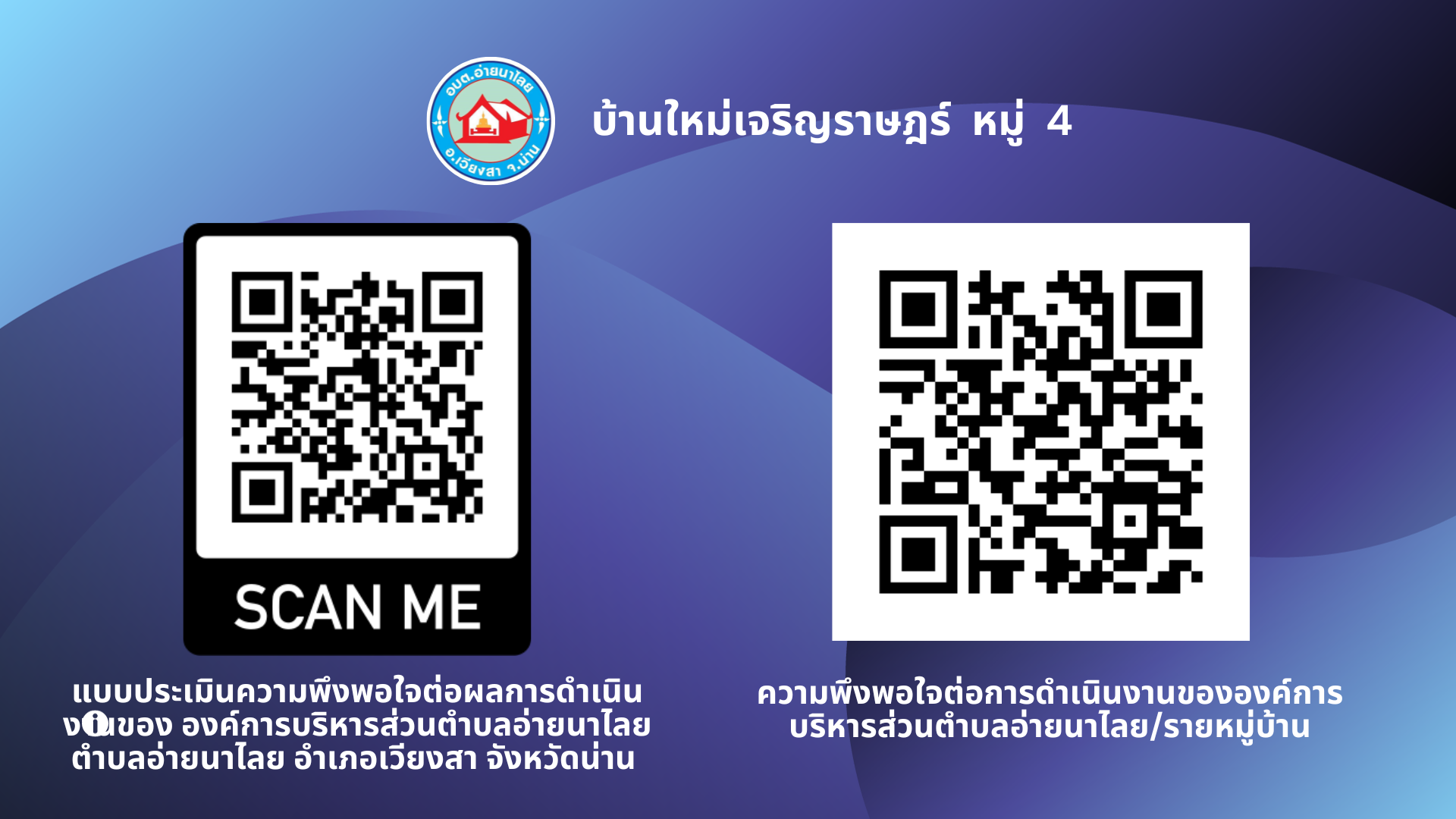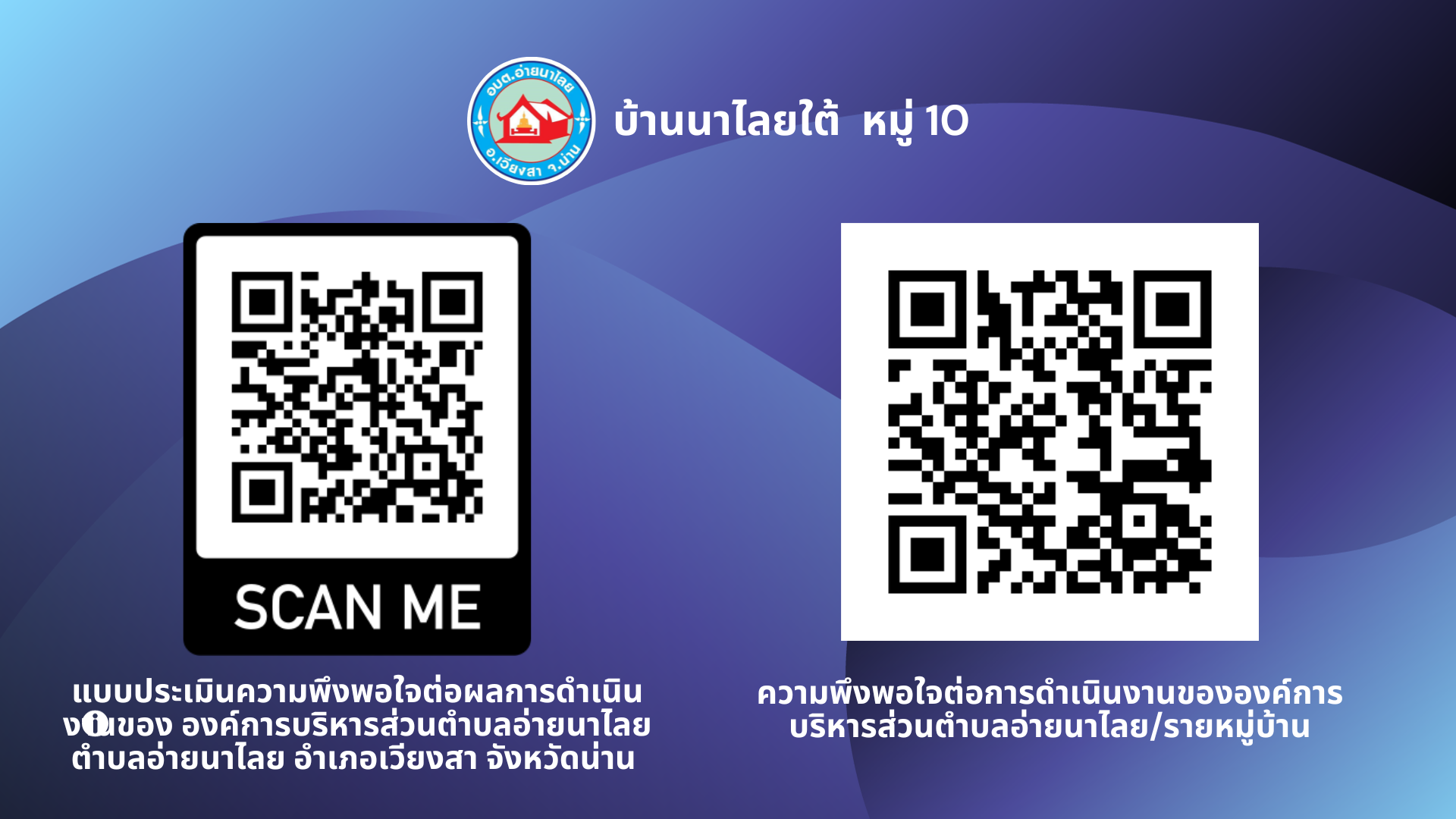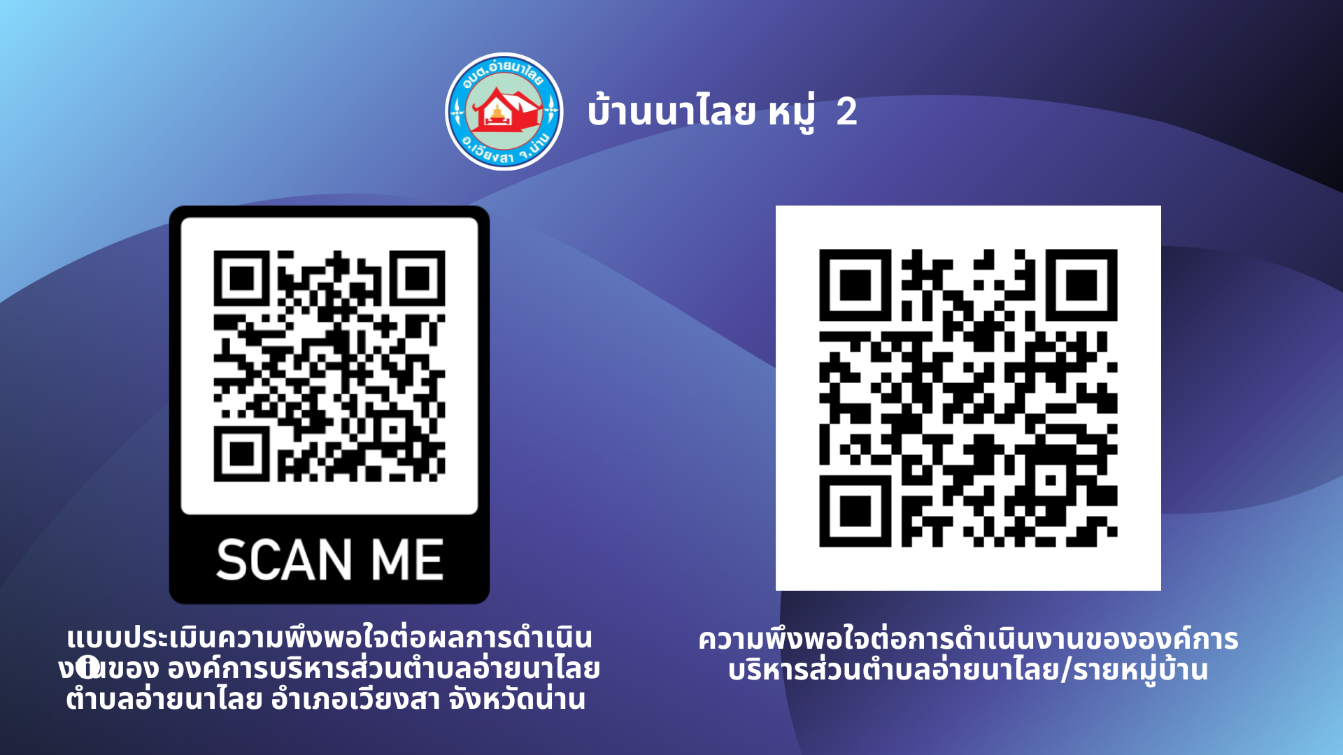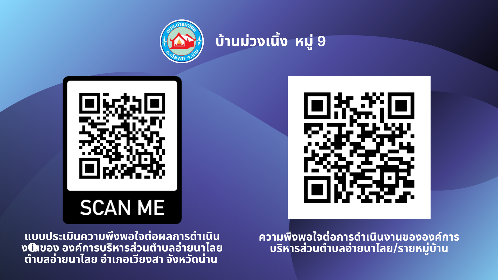 ประชาสัมพันธ์เชิญชวนทำแบบประเมินความพึงพอใจต่อผลการดำเนินงานของอบต.อ่ายนาไลย และ รายหมู่บ้าน ท่านสามารถสแกน QR Code ตามหมู่บ้านของท่านเพื่อทำการประเมินได้เลย ขอบคุณครับ/ค่ะ