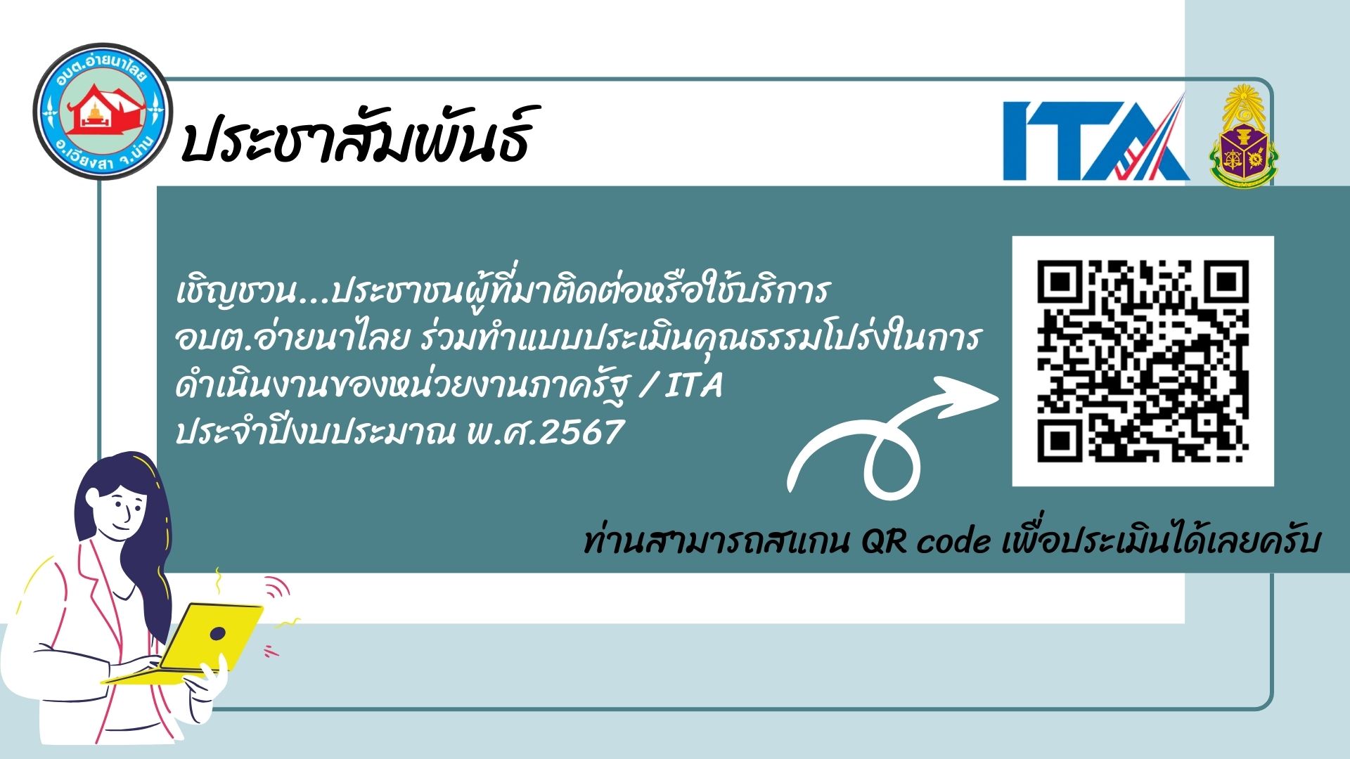 ขอเชิญชวนประชาชนผู้รับบริการหรือผู้ที่มาติดต่อ อบต.อ่ายนาไลย ร่วมประเมินคุณธรรมและความโปร่งใสในการดำเนินงานของหน่วยงานภาครัฐ /ITA ประจำปีงบประมาณ พ.ศ.2567