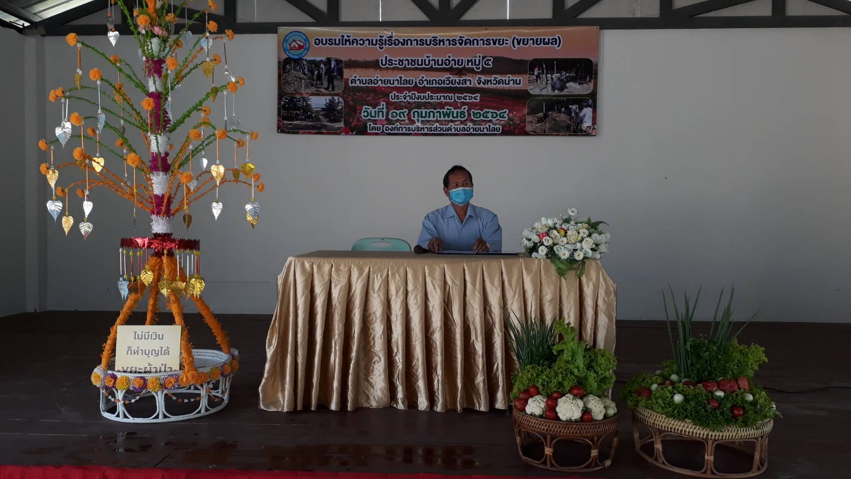 วันที่ 19 กุมภาพันธ์ 2564 องค์การบริหารส่วนตำบลอ่ายนาไลย ได้จัดอบรมการให้ความรู้โครงการบริหารจัดการขยะในพื้นที่ตำบลอ่ายนาไลย (ขยายผล) บ้านอ่าย หมู่ 5 ตำบลอ่ายนาไลย ร่วมกับผู้นำชุมชน อสม. ประชาชนบ้านอ่าย ร่วมฟังการบรรยายการให้ความรู้ โดยมีการบรรยายการให้ความรู้ จากวิทยากรยาบหัวนา ครับ